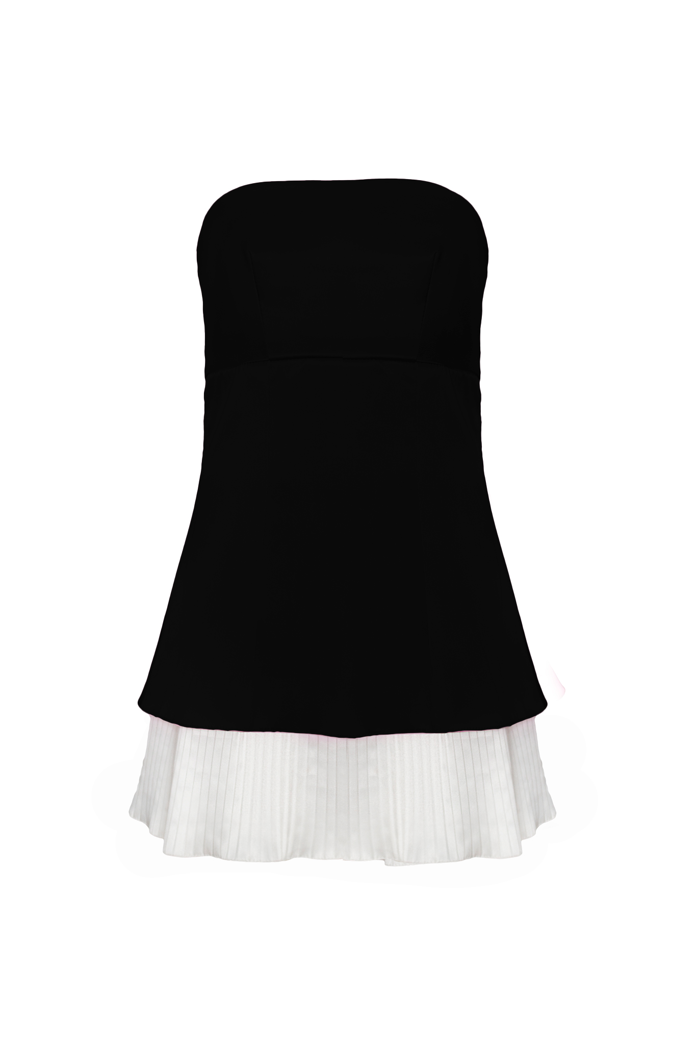 Vestido mini. Corte imperio. Silueta ajustada. Falda interna en tono blanco con plisado. Cremallera posterior.